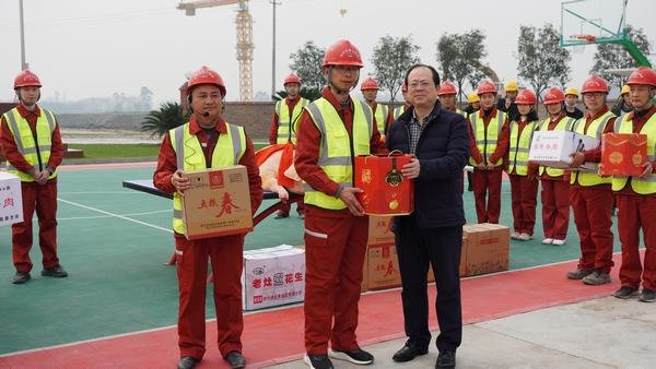 慰問困難職工后,鐘杰董事長一行又驅車深入岷江虎渡溪航電樞紐工程項目慰問一線干部職工并檢查指導工作,向春節期間堅守崗位的干部職工表示新春慰問和祝福,并送上慰問品。之后,在公司黨委書記、董事長代勇,總經理袁斌,副總經理茍仕聰、鄒世界及省水利設計院公司三分院副院長單智杰、項目設總鐘鴻等陪同下,察看了營地建設,接受安全告知后,深入到廠房前池、一期閘壩工程、拌和站等現場檢查指導工作,詳細察看和了解安全生產、進度質量、文明施工、環保水保等相關工作情況,對拌和系統布置、自動化程度、管理制度給予了肯定和贊揚,并對提前做好安全度汛等工作做出要求。