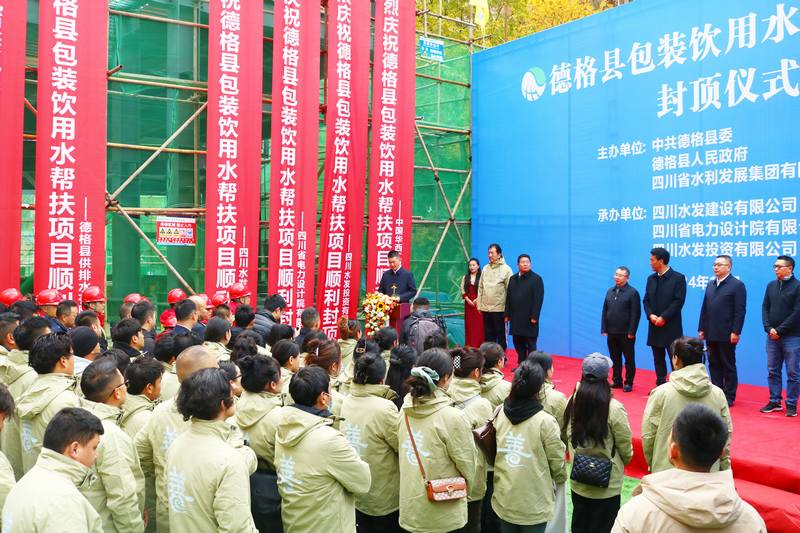 星夜兼程不負(fù)使命,風(fēng)雨無(wú)阻履約踐諾。2024年10月30日,由公司承建的德格縣包裝飲用水幫扶項(xiàng)目廠房主體封頂儀式在項(xiàng)目現(xiàn)場(chǎng)舉行。從最初的藍(lán)圖構(gòu)想,到如今高樓聳立;從基建啟動(dòng)到初步輪廓的展現(xiàn)。德格縣包裝飲用水幫扶項(xiàng)目的順利封頂標(biāo)志著該項(xiàng)目建設(shè)取得開(kāi)工以來(lái)重要的階段性成果,也為后續(xù)施工順利實(shí)施奠定了堅(jiān)實(shí)基礎(chǔ)。 水發(fā)集團(tuán)黨委書(shū)記、董事長(zhǎng)王華,德格縣縣委書(shū)記昌呷次稱,水發(fā)集團(tuán)黨委委員、董事、建設(shè)公司黨委書(shū)記、董事長(zhǎng)袁斌出席儀式并致辭。