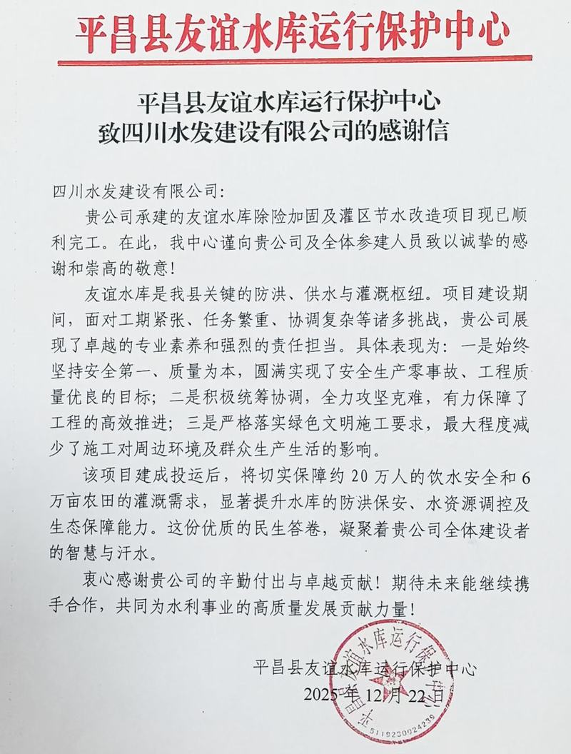近日,公司承建的“平昌縣友誼水庫除險(xiǎn)加固及灌區(qū)節(jié)水改造項(xiàng)目”獲得業(yè)主單位高度認(rèn)可。平昌縣友誼水庫運(yùn)行保護(hù)中心特向公司發(fā)來感謝信,并向公司參建項(xiàng)目部授予“水發(fā)鐵軍”榮譽(yù)錦旗。