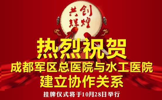 10月28日,成都軍區總醫院將與四川省水利電力工程局職工醫院(簡稱水工醫院)簽訂《合作協議》,并授牌“成都軍區總醫院輔導醫院”。