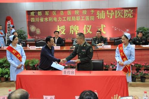 成都軍區總醫院外聯部主任、高級工程師張虎軍與局職工醫院副院長樊學良現場簽訂了協作醫院合作協議,譚映軍大校為合作醫院授牌。