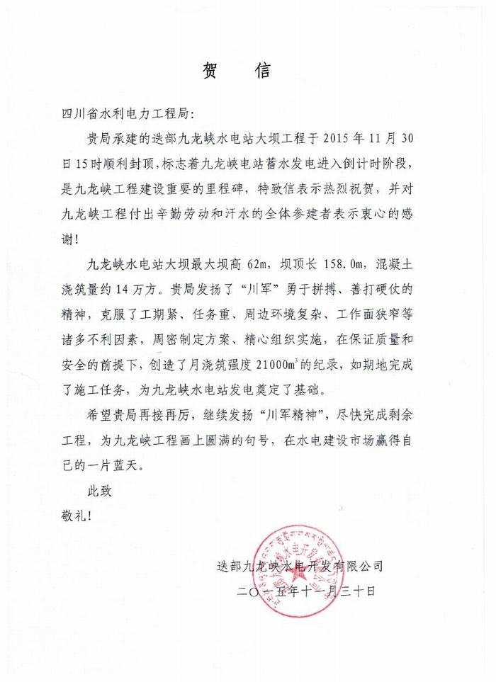 隨后,甘肅九龍峽公司董事長楊利民和引大監(jiān)理公司總監(jiān)徐全明分別致辭,并向工程局致賀信祝賀。
