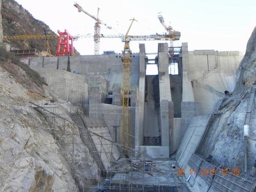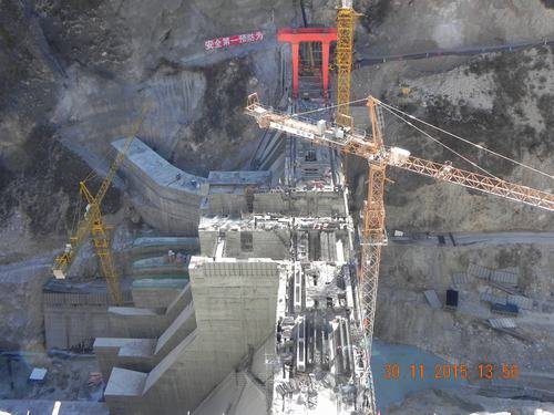 11月30日15時,九龍峽水電站大壩工程4#壩段2#梁吊裝完閉,標(biāo)志著歷時3年艱辛建設(shè)的九龍峽水電站大壩工程已達到全線封頂目標(biāo)。九龍峽水電站共有9個壩段,壩高62米,壩長158米,混凝土澆筑量約14萬方。