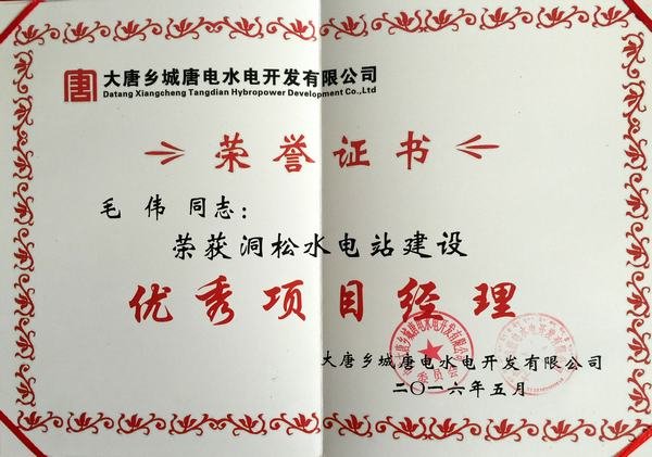 2016年5月10日16時,大唐鄉城唐電水電開發有限公司在鄉城縣召開了簡潔而隆重的“碩淉電站投產發電先進表彰大會”,四川省水利電力工程局榮獲洞松水電站建設“重合同、守信用”單位榮譽稱號,項目經理毛偉榮獲洞松水電站建設“優秀項目經理”榮譽稱號。