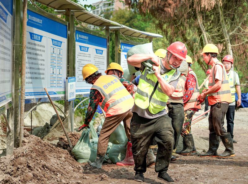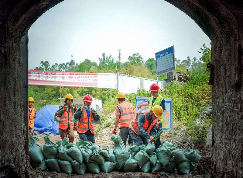 本次演練模擬威遠縣境內(nèi)遭遇強降雨天氣,降雨量在短時間急劇上漲,渠道上游來水即將漫入冒殼山隧洞施工現(xiàn)場,面對這一“突發(fā)狀況”,項目部立即啟動應(yīng)急預(yù)案,各小組迅速響應(yīng),分工明確,有條不紊地開展搶險工作。在搶險過程中,搶險人員緊密配合,將裝滿粘土的沙袋依次堆疊,對隧洞口進行封堵;經(jīng)過爭分奪秒的奮戰(zhàn),隧洞口成功完成搶險封堵,應(yīng)急處置任務(wù)圓滿結(jié)束。